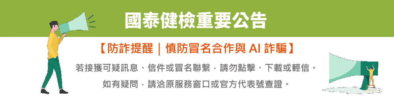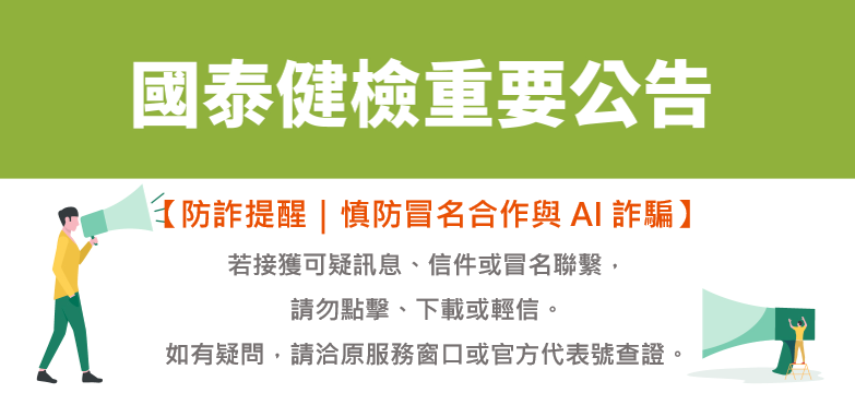 近期如收到可疑訊息、信件,或有人冒用本公司名義進行合作洽談、業務聯繫,請務必提高警覺。 請勿點擊不明連結、下載附件,也不要輕信來源不明的影像、文件或訊息內容。 詐騙手法不斷翻新,甚至可能結合 AI 技術製作擬真內容,增加辨識難度。 如有任何疑問,請直接聯繫原服務窗口,或撥打官方代表號查證。 敬請提高警覺,共同防範詐騙;保護資訊安全,從即時求證開始。 國泰健康管理 關心您