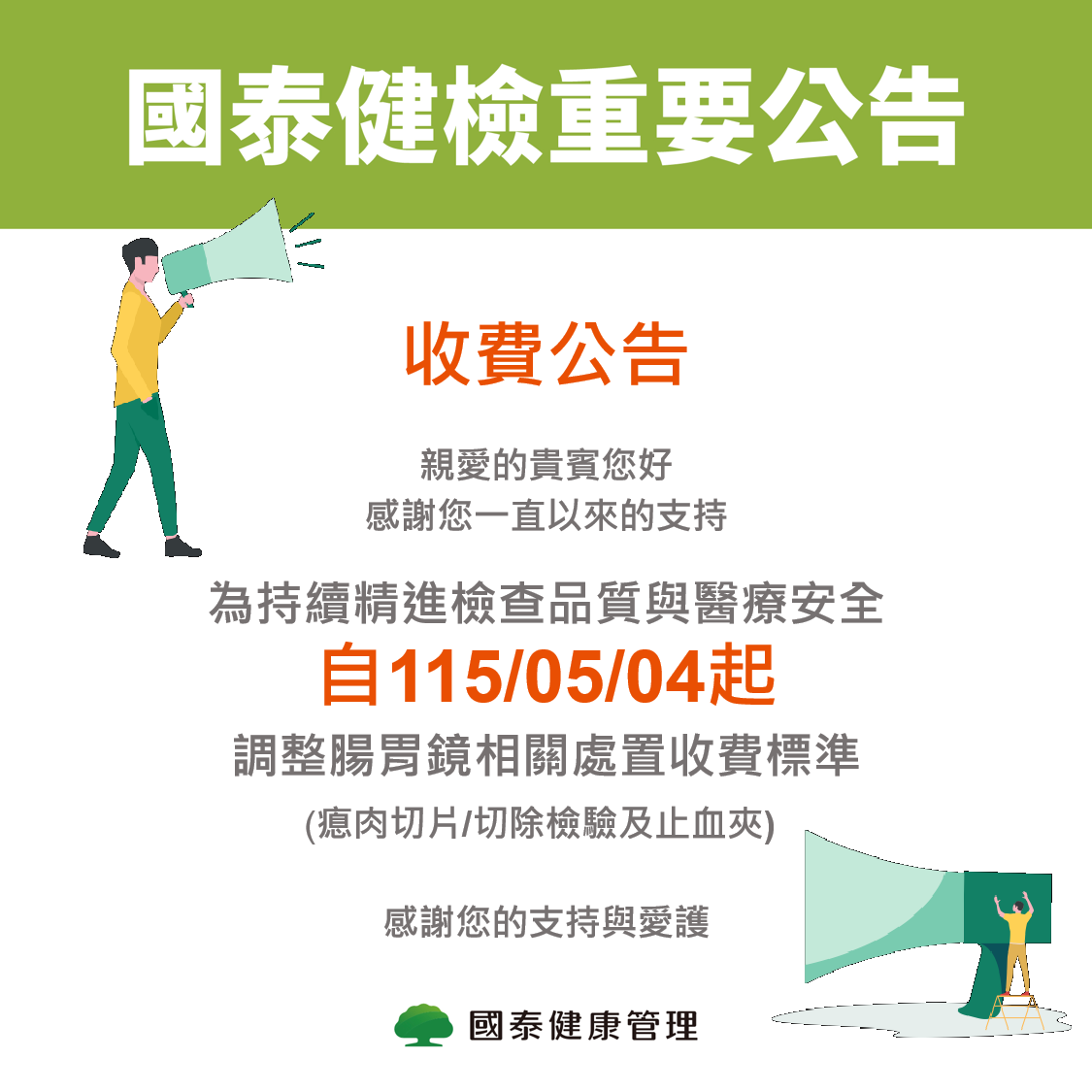 為持續精進檢查品質與醫療安全,本中心將於 115年5月4日起,調整腸胃鏡相關處置之收費標準。