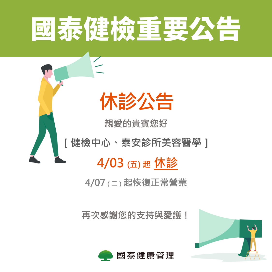 【休診公告】健檢中心及泰安診所美容醫學連假休診
