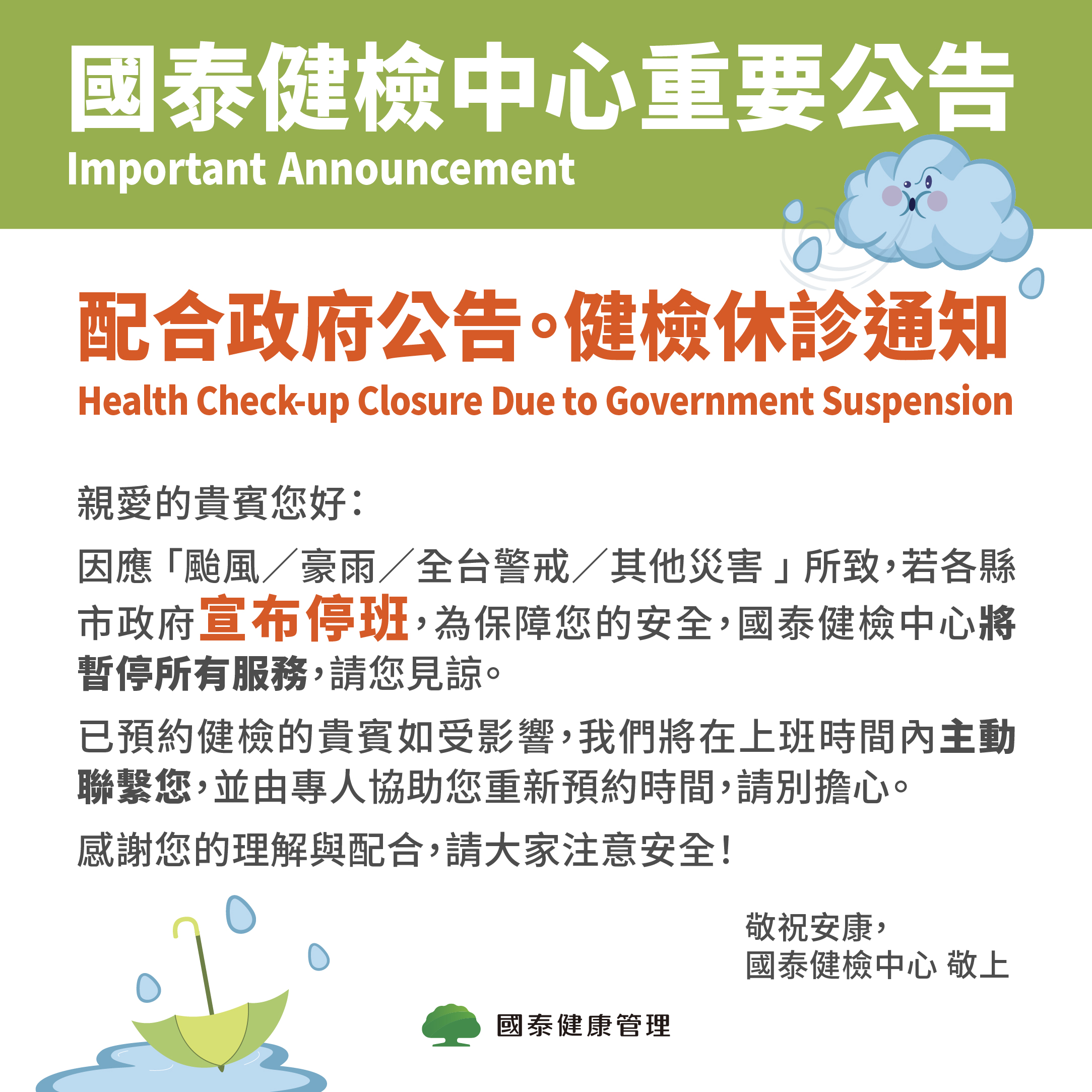 In response to the approaching typhoon, Cathay Physical Examination Center will temporarily suspend all services if the city or county government announces a work suspension.