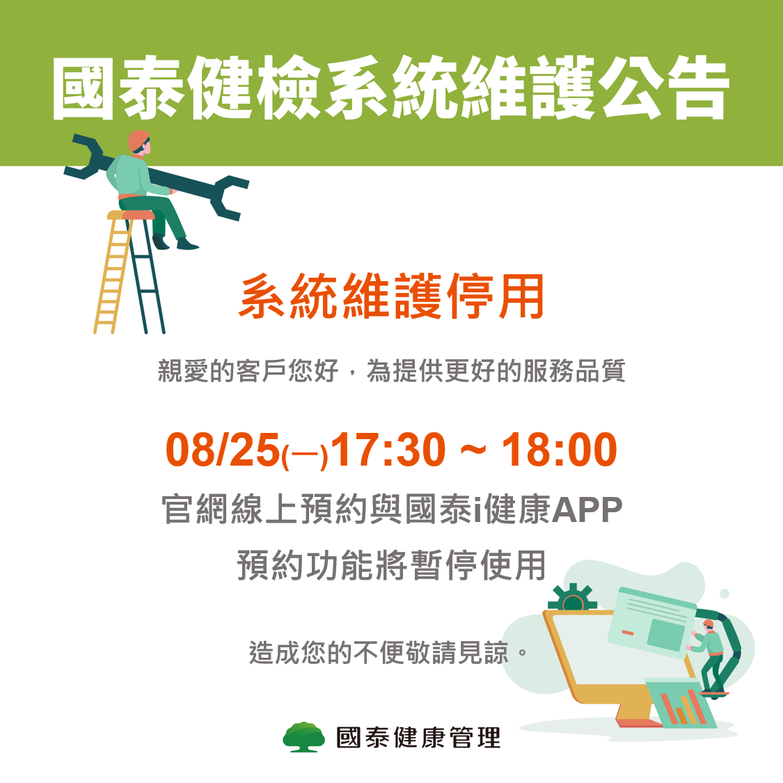 新聞中心 2025-08-24 【系統維護公告】官網與國泰i健康APP維護停用 【系統更新公告】 親愛的客戶您好,為提供更好的服務品質 8/25 (一) 17:30 - 18:00 官網線上預約 與 國泰i健康APP 將暫停使用 再請您避開此時段使用,如遇特殊狀況,更新時間可能延長 造成不便敬請見諒,謝謝您