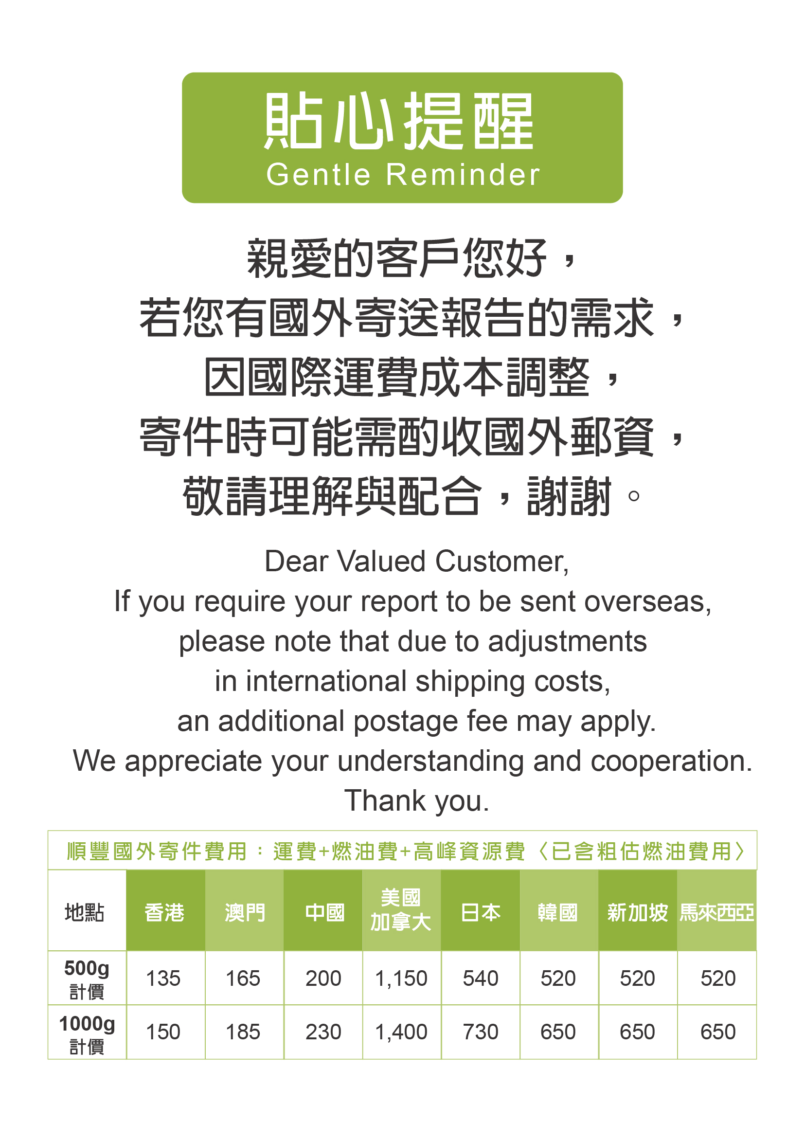 親愛的客戶您好,若您有國外寄送報告的需求,因國際運費成本調整,寄件時可能需酌收國外郵資,敬請理解與配合,謝謝。