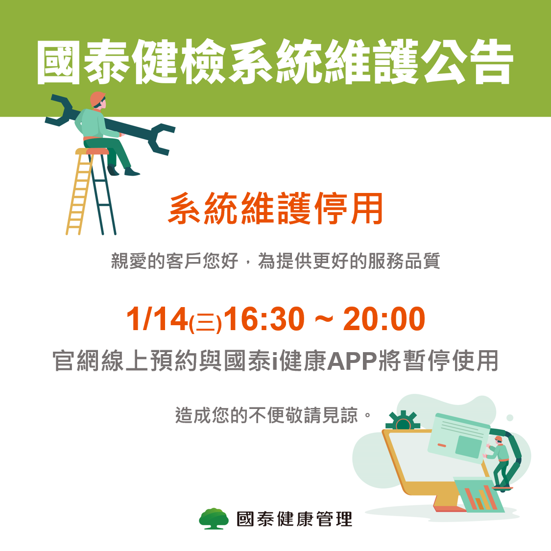 新聞中心 2026-01-08 【系統維護公告】官網與國泰i健康APP 於1/14(三)16:30-20:00暫停使用 【系統維護公告】 親愛的客戶您好,為提供更好的服務品質 1/14 (三) 16:30 - 20:00 官網線上預約 與 國泰i健康APP 進行系統更新,更新期間部分功能將暫停使用, 再請您避開此時段預約,如遇特殊狀況,更新時間可能延長 造成不便敬請見諒,謝謝您