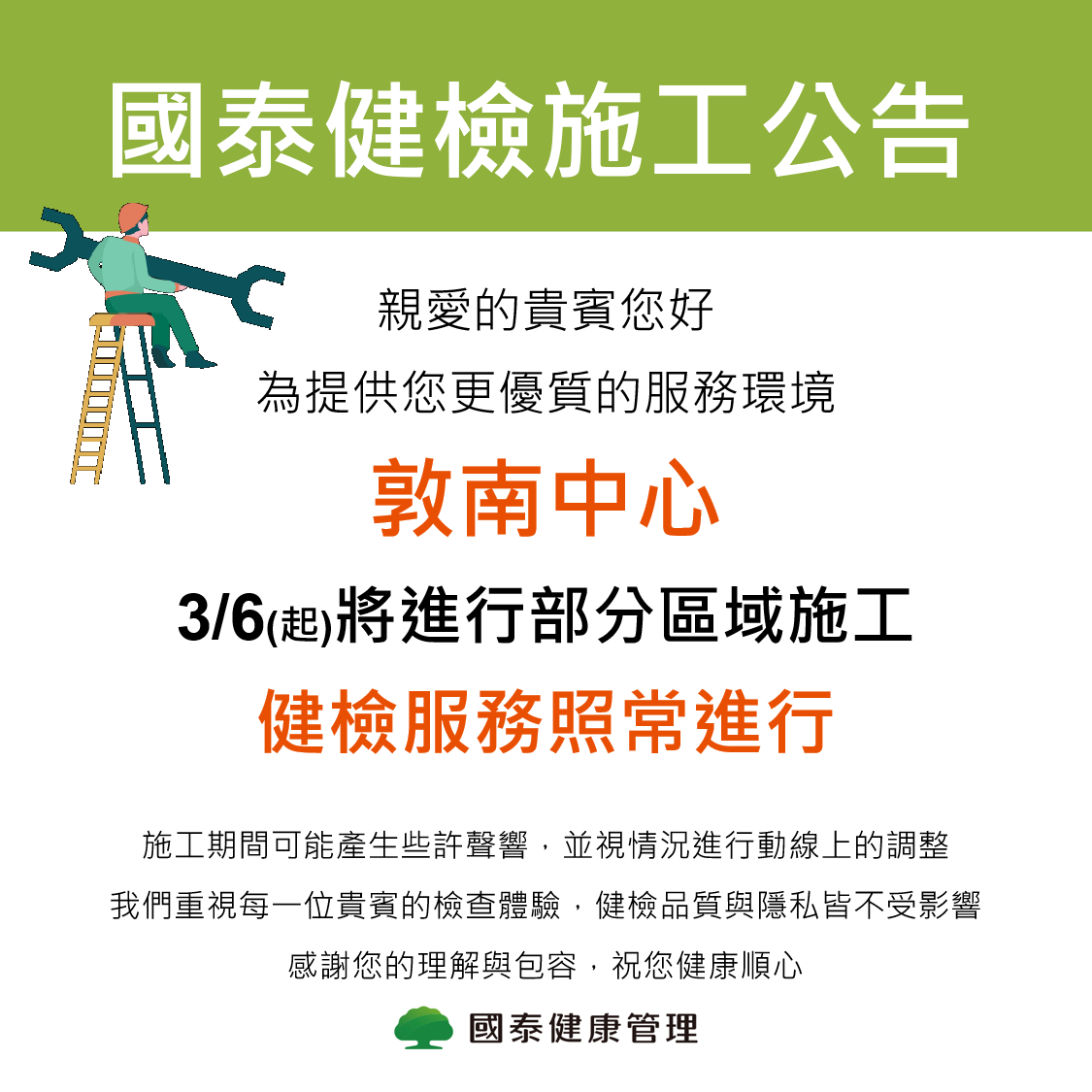 為提供您更優質的服務環境,國泰健檢敦南中心3/6起將進行部分區域施工,健檢服務照常進行。