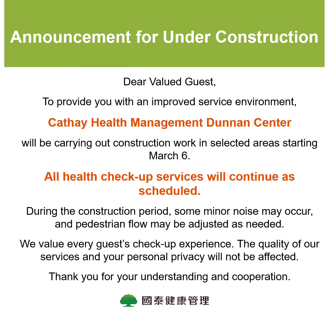 Cathay Health Management Dunnan Center will be carrying out construction work in selected areas starting March 6.